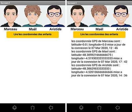 Le bouton jaune permet de lire les coordonnées GPS des enfants.